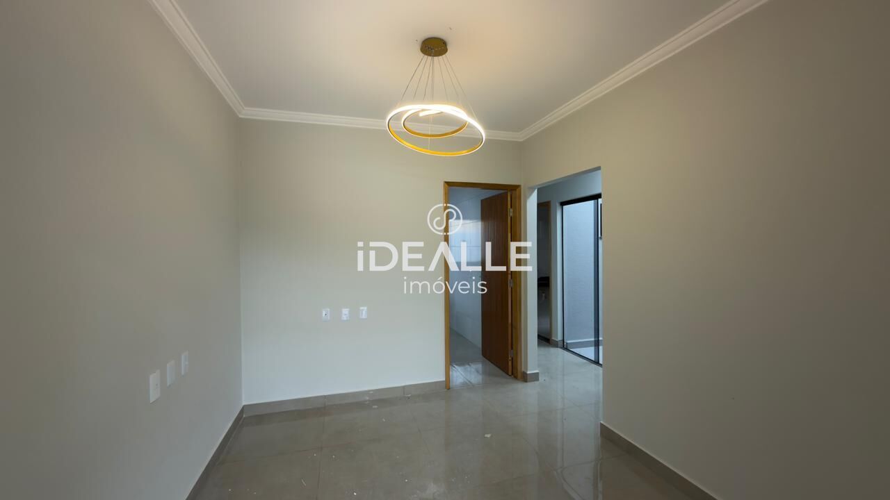 Imóvel com ótimo acabamento, piso porcelanato e lustre na sala.